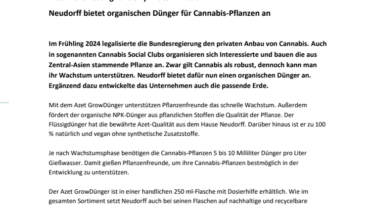 Der Azet GrowDünger ist in einer handlichen 250 ml-Flasche mit Dosierhilfe erhältlich. Wie im gesamten Sortiment setzt Neudorff auch bei seinen Flaschen auf nachhaltige und recycelbare Verpackungen. Die Flasche des Azet GrowDüngers hat einen Recycling-Anteil von über 90 %. Zur Pflege von Cannabis-Pflanzen bietet das Unternehmen ergänzend den ebenfalls neu im Sortiment aufgenommenen torffreien NeudoHum Grow All-Mix an.