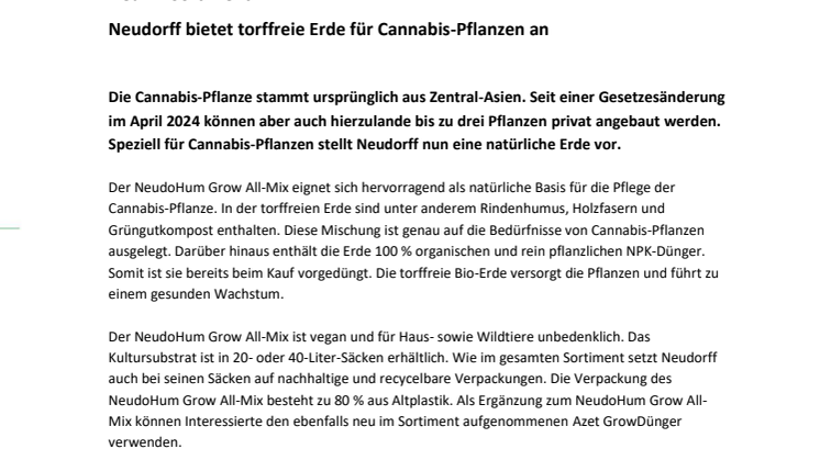 Neudorff bietet torffreie Erde für Cannabis-Pflanzen an