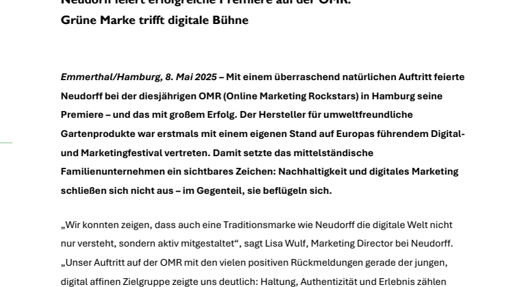 Emmerthal/Hamburg, 8. Mai 2025 – Mit einem überraschend natürlichen Auftritt feierte Neudorff bei der diesjährigen OMR (Online Marketing Rockstars) in Hamburg seine Premiere – und das mit großem Erfolg. Der Hersteller für umweltfreundliche Gartenprodukte war erstmals mit einem eigenen Stand auf Europas führendem Digital- und Marketingfestival vertreten. Damit setzte das mittelständische Familienunternehmen ein sichtbares Zeichen: Nachhaltigkeit und digitales Marketing schließen sich nicht aus – im Gegenteil, sie beflügeln sich.
