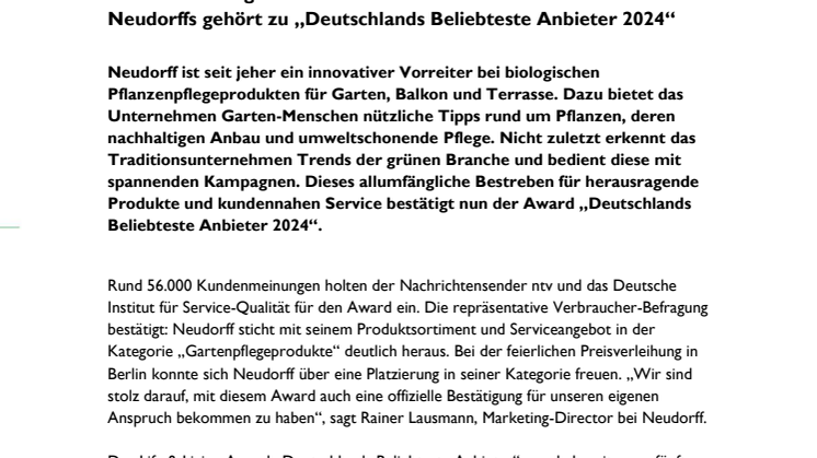 Neudorff ist seit jeher ein innovativer Vorreiter bei biologischen Pflanzenpflegeprodukten für Garten, Balkon und Terrasse. Dazu bietet das Unternehmen Garten-Menschen nützliche Tipps rund um Pflanzen, deren nachhaltigen Anbau und umweltschonende Pflege. Nicht zuletzt erkennt das Traditionsunternehmen Trends der grünen Branche und bedient diese mit spannenden Kampagnen. Dieses allumfängliche Bestreben für herausragende Produkte und kundennahen Service bestätigt nun der Award „Deutschlands Beliebteste Anbieter 2024“.