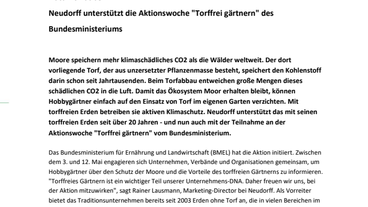 Das Bundesministerium für Ernährung und Landwirtschaft (BMEL) hat die Aktion initiiert. Zwischen dem 3. und 12. Mai engagieren sich Unternehmen, Verbände und Organisationen gemeinsam, um Hobbygärtner über den Schutz der Moore und die Vorteile des torffreien Gärtnerns zu informieren. "Torffreies Gärtnern ist ein wichtiger Teil unserer Unternehmens-DNA. Daher freuen wir uns, bei der Aktion mitzuwirken", sagt Rainer Lausmann, Marketing-Director bei Neudorff. Als Vorreiter bietet das Traditionsunternehmen bereits seit 2003 Erden ohne Torf an, die in vielen Bereichen im Garten und auf dem Balkon den Erfolg des Gärtnerns unterstützen. Begleitet wird das durch die ständige Weiterentwicklung der Produkte, um innovative Lösungen mit Zukunftspotenzial anzubieten.
