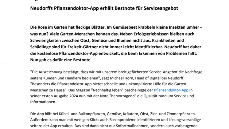 "Die Auszeichnung bestätigt, dass wir mit unserem breit gefächerten Service-Angebot die Nachfrage seitens Kunden und Händlern bedienen", sagt Michael Horn, Head of Digital bei Neudorff. "Besonders die Pflanzendoktor-App bietet schnelle und unkomplizierte Hilfe für die Garten-Menschen zu Hause". Das Magazin "Nachhaltig leben" bescheinigte der Pflanzendoktor-App in seiner ersten Ausgabe 2024 nun mit der Note "hervorragend" die Qualität rund um Service und Informationen.