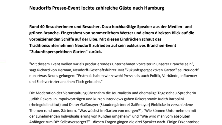 Rund 40 Besucherinnen und Besucher. Dazu hochkarätige Speaker aus der Medien- und grünen Branche. Eingerahmt von sommerlichem Wetter und einem direkten Blick auf die vorbeiziehenden Schiffe auf der Elbe. Mit diesen Eindrücken schaut das Traditionsunternehmen Neudorff zufrieden auf sein exklusives Branchen-Event "Zukunftsperspektiven Garten" zurück.