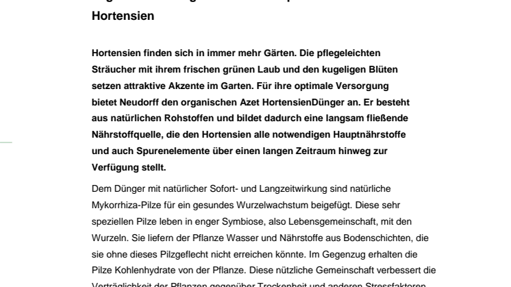 Hortensien finden sich in immer mehr Gärten. Die pflegeleichten Sträucher mit ihrem frischen grünen Laub und den kugeligen Blüten setzen attraktive Akzente im Garten. Für ihre optimale Versorgung bietet Neudorff den organischen Azet HortensienDünger an. Er besteht aus natürlichen Rohstoffen und bildet dadurch eine langsam fließende Nährstoffquelle, die den Hortensien alle notwendigen Hauptnährstoffe und auch Spurenelemente über einen langen Zeitraum hinweg zur Verfügung stellt.