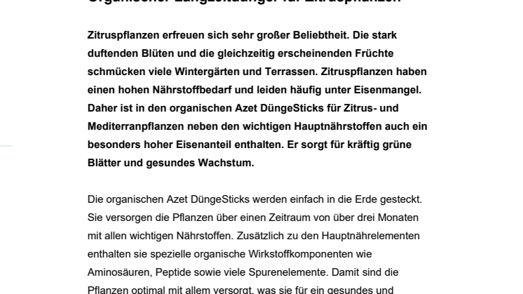 Zitruspflanzen erfreuen sich sehr großer Beliebtheit. Die stark duftenden Blüten und die gleichzeitig erscheinenden Früchte schmücken viele Wintergärten und Terrassen. Zitruspflanzen haben einen hohen Nährstoffbedarf und leiden häufig unter Eisenmangel. Daher ist in den organischen Azet DüngeSticks für Zitrus- und Mediterranpflanzen neben den wichtigen Hauptnährstoffen auch ein besonders hoher Eisenanteil enthalten. Er sorgt für kräftig grüne Blätter und gesundes Wachstum.