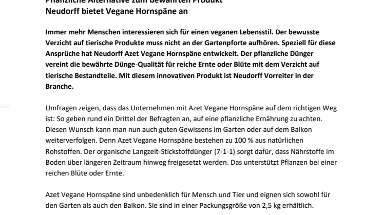 Immer mehr Menschen interessieren sich für einen veganen Lebensstil. Das bewusste Verzicht auf tierische Produkte darf nicht an der Gartenpforte aufhören. Speziell für diese Ansprüche hat Neudorff Azet Vegane Hornspäne entwickelt. Der pflanzliche Dünger vereint die bewährte Dünge-Qualität für reiche Ernte oder Blüte mit dem Verzicht auf tierische Bestandteile. Mit diesem innovativen Produkt ist Neudorff Vorreiter in der Branche.