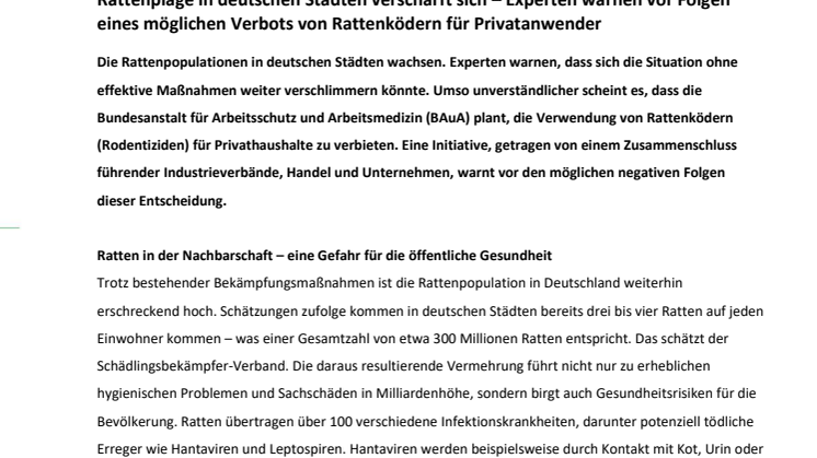 Die Rattenpopulationen in deutschen Städten wachsen. Experten warnen, dass sich die Situation ohne effektive Maßnahmen weiter verschlimmern könnte. Umso unverständlicher scheint es, dass die Bundesanstalt für Arbeitsschutz und Arbeitsmedizin (BAuA) plant, die Verwendung von Rattenködern (Rodentiziden) für Privathaushalte zu verbieten. Eine Initiative, getragen von einem Zusammenschluss führender Industrieverbände, Handel und Unternehmen, warnt vor den möglichen negativen Folgen dieser Entscheidung.
