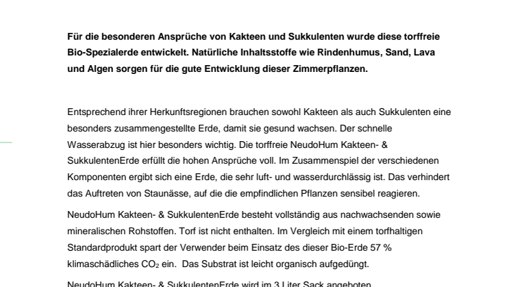 Entsprechend ihrer Herkunftsregionen brauchen sowohl Kakteen als auch Sukkulenten eine besonders zusammengestellte Erde, damit sie gesund wachsen. Der schnelle Wasserabzug ist hier besonders wichtig. Die torffreie NeudoHum Kakteen- & SukkulentenErde erfüllt die hohen Ansprüche voll. Im Zusammenspiel der verschiedenen Komponenten ergibt sich eine Erde, die sehr luft- und wasserdurchlässig ist. Das verhindert das Auftreten von Staunässe, auf die die empfindlichen Pflanzen sensibel reagieren.NeudoHum Kakteen- & SukkulentenErde besteht vollständig aus nachwachsenden sowie mineralischen Rohstoffen. Torf ist nicht enthalten. Im Vergleich mit einem torfhaltigen Standardprodukt spart der Verwender beim Einsatz des dieser Bio-Erde 57 % klimaschädliches CO2 ein. Das Substrat ist leicht organisch aufgedüngt.
