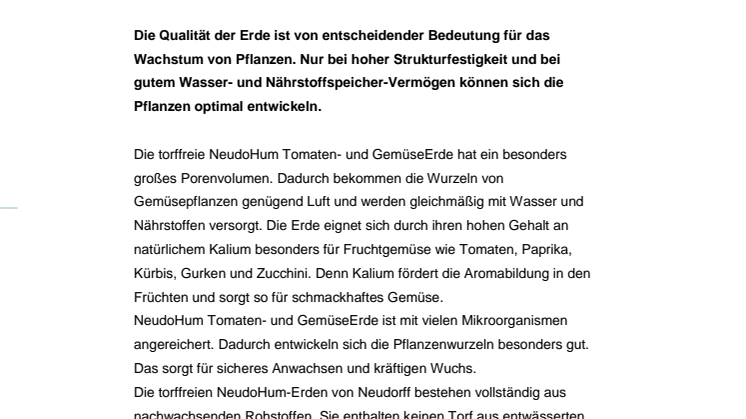 Die torffreien NeudoHum-Erden von Neudorff bestehen vollständig aus nachwachsenden Rohstoffen. Sie enthalten keinen Torf aus entwässerten Mooren. Damit ist ihre Verwendung ein aktiver Beitrag zum Schutz dieser Flächen. Aus diesem Grund empfiehlt sie auch der NABU (Naturschutzbund Deutschland).