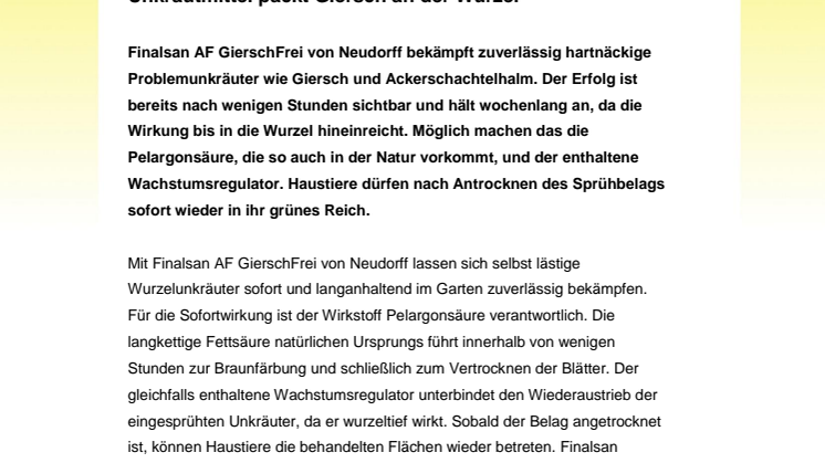 Finalsan AF GierschFrei von Neudorff bekämpft zuverlässig hartnäckige Problemunkräuter wie Giersch und Ackerschachtelhalm. Der Erfolg ist bereits nach wenigen Stunden sichtbar und hält wochenlang an, da die Wirkung bis in die Wurzel hineinreicht. Möglich machen das die Pelargonsäure, die so auch in der Natur vorkommt, und der enthaltene Wachstumsregulator. Haustiere dürfen nach Antrocknen des Sprühbelags sofort wieder in ihr grünes Reich.