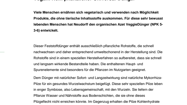 Viele Menschen ernähren sich vegetarisch und verwenden nach Möglichkeit Produkte, die ohne tierische Inhaltsstoffe auskommen. Für diese sehr bewusst lebenden Menschen hat Neudorff den organischen Azet VeggieDünger (NPK 5-3-6) entwickelt.