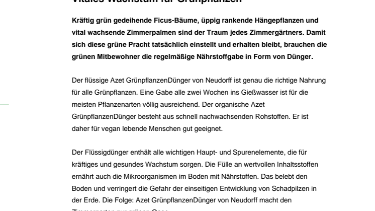 Der Flüssigdünger enthält alle wichtigen Haupt- und Spurenelemente, die für kräftiges und gesundes Wachstum sorgen. Die Fülle an wertvollen Inhaltsstoffen ernährt auch die Mikroorganismen im Boden mit Nährstoffen. Das belebt den Boden und verringert die Gefahr der einseitigen Entwicklung von Schadpilzen in der Erde. Die Folge: Azet GrünpflanzenDünger von Neudorff macht den Zimmergarten zur grünen Oase.