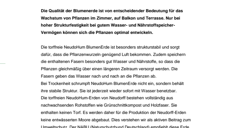 Die torffreien NeudoHum-Erden von Neudorff bestehen vollständig aus nachwachsenden Rohstoffen wie Grünschnittkompost und Holzfaser. Sie enthalten keinen Torf. Es werden daher für die Produktion der Neudorff-Erden keine entwässerten Moore abgebaut. Dies verstehen wir als aktiven Beitrag zum Umweltschutz. Der NABU (Naturschutzbund Deutschland) empfiehlt diese Erde, weil sie torffrei ist. Natürlich sind die NeudoHum-Erden entsprechend den Bedürfnissen der Pflanzen vorgedüngt.