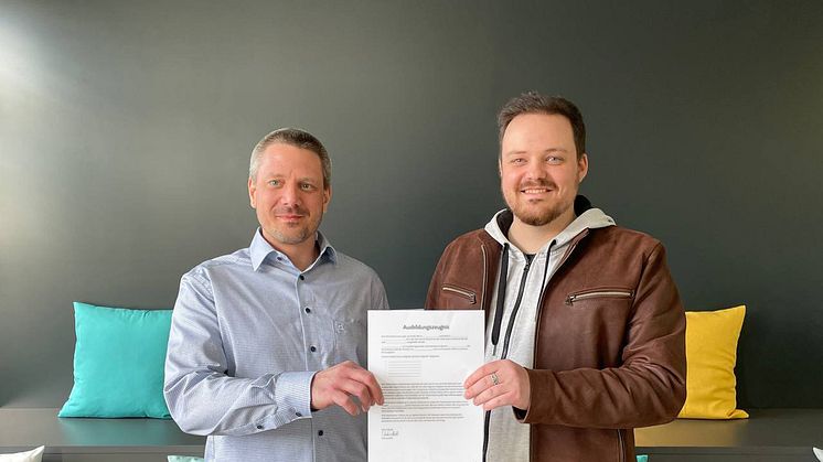 Ausbilder Sven Bender freut sich nun über einen weiteren fertig ausgebildeten Kollegen. Lukas wird das Team Voice erweitern.