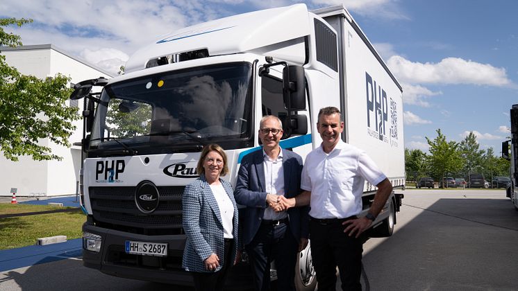 Partnerschaft für Mercedes Benz Trucks Nutzfahrzeugzentren an. Sandra Schlöder, Own Retail After Sales MB TrucksDeutschland Daimler Truck AG, Dr. Volker Hüntrup, Director Own Retail Mercedes Benz Trucks Europe Daimler Truck AG und Bernhard Wasner, CEO Paul Group (v.l.n.r.)