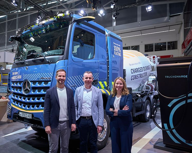 Achim Puchert, CEO Mercedes-Benz Trucks, Bernhard Wasner, CEO Paul Group, Stina Fagerman, Leiterin Marketing, Vertrieb und Services Mercedes-Benz Trucks vor dem eArocs 400 auf der bauma 2025.