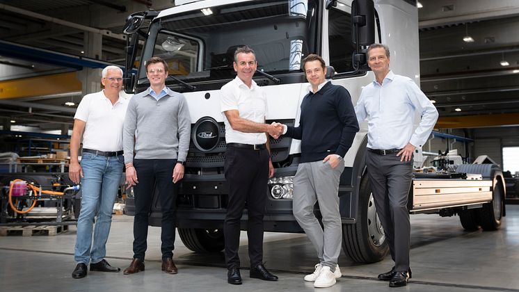 Jörg Debus, Berater, Philipp Juhl, M&A, Hoyer, Bernhard Wasner, CEO, Paul Group, Thomas Hoyer, geschäftsführender Gesellschafter, Hoyer und Andreas Bartels, CFO, Paul Group (v.l.n.r) gehen strategische Partnerschaft ein.
