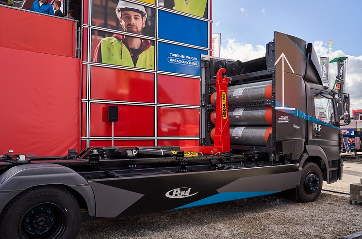 Paul Group und PALFINGER stellen im Rahmen Ihrer Entwicklungspartnerschaft Vorserienfahrzeug PH2P® Truck mit Integration des elektro-hydraulisch betriebenen PALFINGER Hakengeräts auf bauma 22 vor.
