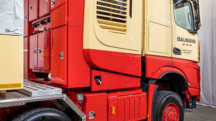 Der umgerüstete Lkw konnte Mitte Oktober 2023 an den Schwertransportspezialisten Baumann übergeben werden – die Spezialisten vom TÜV haben das Sonderfahrzeug per Einzelabnahme nach §13 EG-FGV bereits zugelassen und es kann ab sofort in den Einsatz gehen.