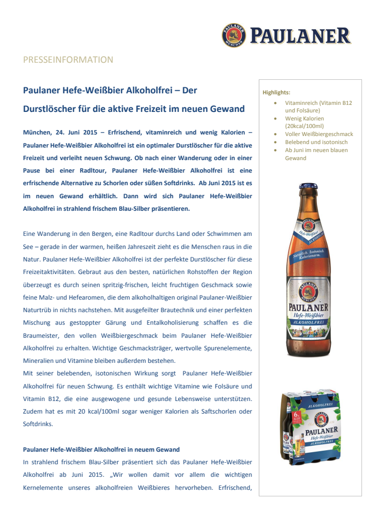 München, 24. Juni 2015 – Erfrischend, vitaminreich und wenig Kalorien – Paulaner Hefe-Weißbier Alkoholfrei ist ein optimaler Durstlöscher für die aktive Freizeit und verleiht neuen Schwung. Ob nach einer Wanderung oder in einer Pause bei einer Radltour, Paulaner Hefe-Weißbier Alkoholfrei ist eine erfrischende Alternative zu Schorlen oder Softdrinks. Ab Juni 2015 ist es im neuen Gewand erhältlich