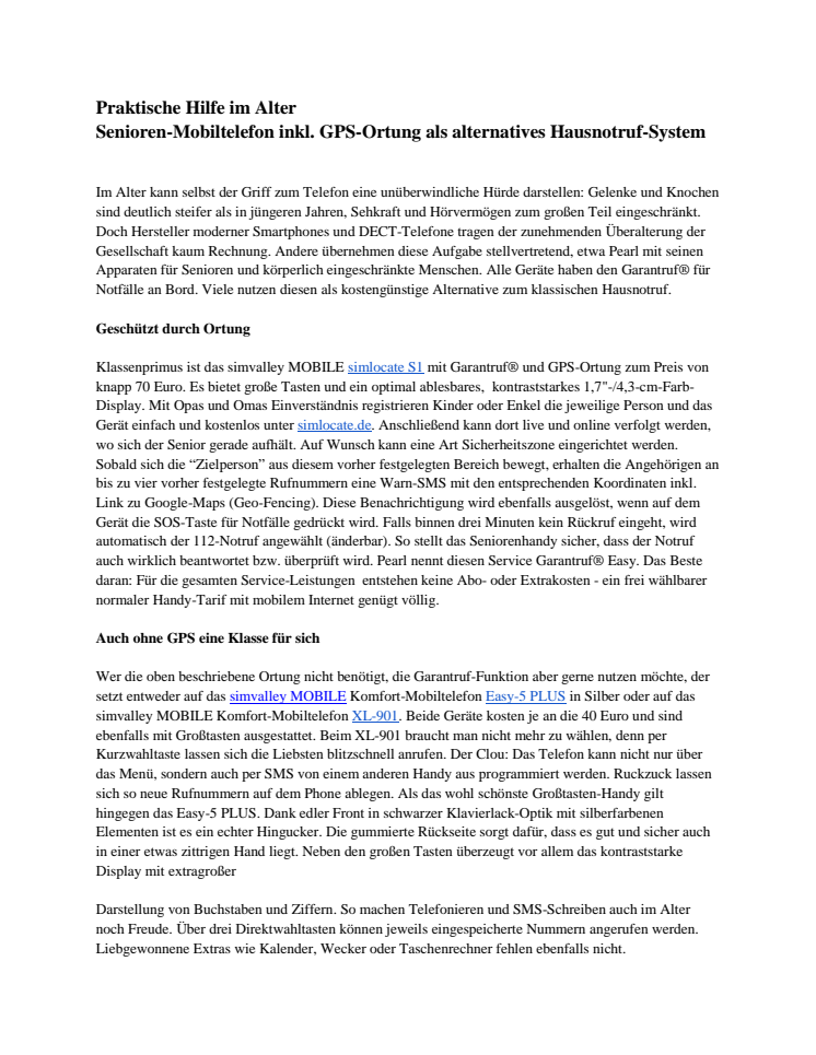 Moderne Smartphones und DECT-Telefone sind nicht immer für alte und körperlich eingeschränkte Personen geeignet. Die neuen Senioren-Telefone von simvalley-MOBILE verfügen dagegen über ein kontrastreiches Display und Großtasten sowie die Garantruf-Funktion, die u. U. als kostengünstiger Ersatz zum klassischen Hausnotruf dienen kann.
