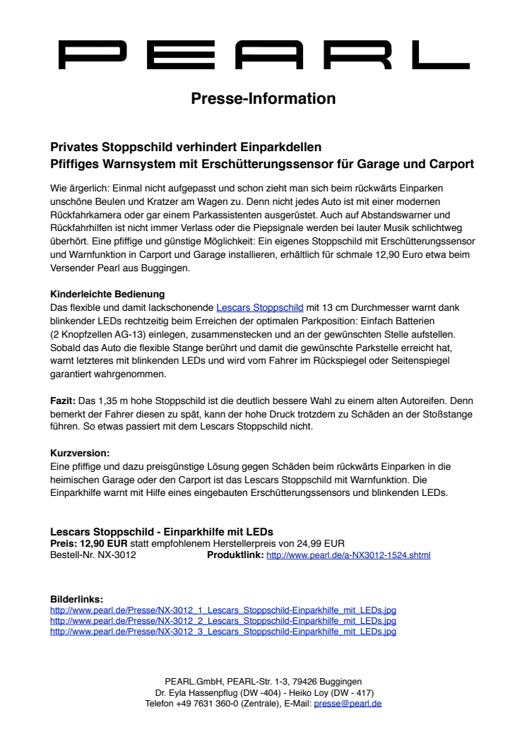 Eine pfiffige und dazu preisgünstige Lösung gegen Schäden beim rückwärts Einparken in die heimischen Garage oder den Carport ist das Lescars Stoppschild mit Warnfunktion. Die Einparkhilfe warnt mit Hilfe eines eingebauten Erschütterungssensors und blinkenden LEDs.
