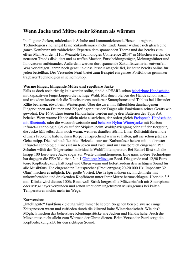 „Intelligente“ Funktionskleidung wird immer beliebter. So gehen beispielsweise einige Zeitgenossen warm und zufrieden durch die klirrend kalte Winterlandschaft. Wie das? Möglich machen das beheizbare Kleidungsstücke wie Jacken und Handschuhe. Auch die Mütze muss nicht allein zum Wärmen der Ohren dienen. Beim Versender Pearl sorgt die Kopfbedeckung z.B. für den richtigen Sound.