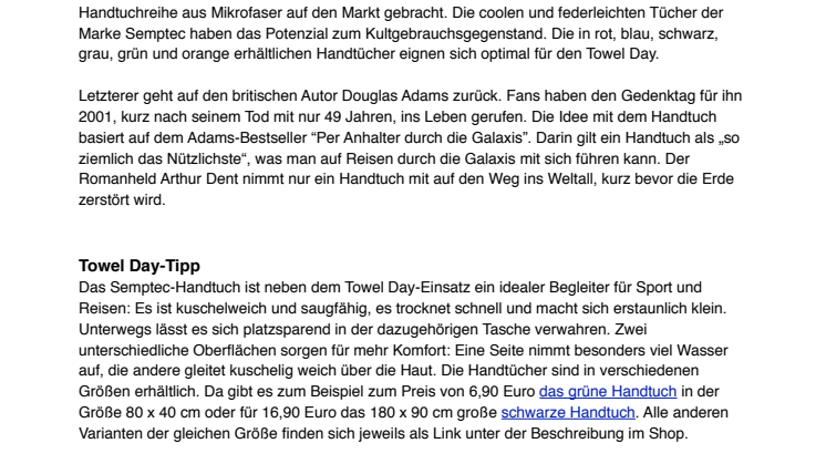 Das Semptec-Handtuch ist neben dem Towel Day-Einsatz ein idealer Begleiter für Sport und Reisen: Es ist kuschelweich und saugfähig, es trocknet schnell und macht sich erstaunlich klein. Unterwegs lässt es sich platzsparend in der dazugehörigen Tasche verwahren. Zwei unterschiedliche Oberflächen sorgen für mehr Komfort: Eine Seite nimmt besonders viel Wasser auf, die andere gleitet kuschelig weich über die Haut. Die Handtücher sind in verschiedenen Größen erhältlich. Da gibt es zum Beispiel zum Preis von 6,90 Euro das grüne Handtuch in der Größe 80 x 40 cm oder für 16,90 Euro das 180 x 90 cm große schwarze Handtuch. Alle anderen Varianten der gleichen Größe finden sich jeweils als Link unter der Beschreibung im Shop.
