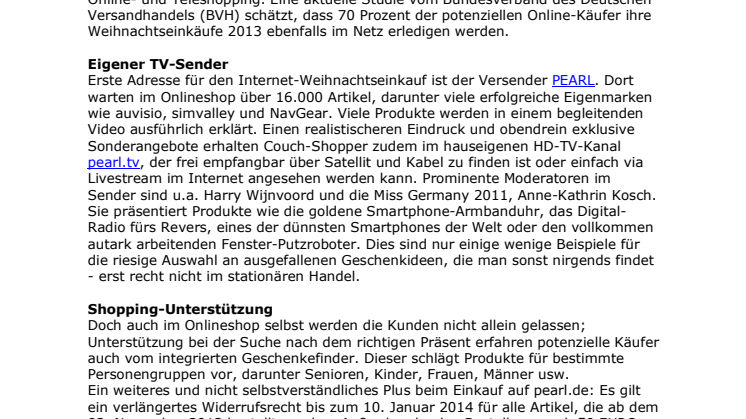 Erste Adresse für den Internet-Weihnachtseinkauf ist der Versender PEARL. Dort warten im Onlineshop über 16.000 Artikel, darunter viele erfolgreiche Eigenmarken wie auvisio, simvalley und NavGear. Viele Produkte werden in einem begleitenden Video ausführlich erklärt. Einen realistischeren Eindruck und obendrein exklusive Sonderangebote erhalten Couch-Shopper zudem im hauseigenen HD-TV-Kanal pearl.tv, der frei empfangbar über Satellit und Kabel zu finden ist oder einfach via Livestream im Internet angesehen werden kann. Prominente Moderatoren im Sender sind u.a. Harry Wijnvoord und die Miss Germany 2011, Anne-Kathrin Kosch. Sie präsentiert Produkte wie die goldene Smartphone-Armbanduhr, das Digital-Radio fürs Revers, eines der dünnsten Smartphones der Welt oder den vollkommen autark arbeitenden Fenster-Putzroboter. Dies sind nur einige wenige Beispiele für die riesige Auswahl an ausgefallenen Geschenkideen, die man sonst nirgends findet - erst recht nicht im stationären Handel.