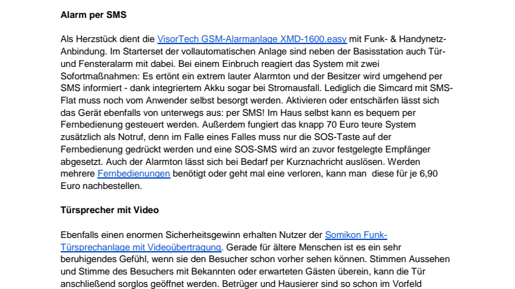 Ebenfalls einen enormen Sicherheitsgewinn erhalten Nutzer der Somikon Funk-Türsprechanlage mit Videoübertragung. Gerade für ältere Menschen ist es ein sehr beruhigendes Gefühl, wenn sie den Besucher schon vorher sehen können. Stimmen Aussehen und Stimme des Besuchers mit Bekannten oder erwarteten Gästen überein, kann die Tür anschließend sorglos geöffnet werden. Betrüger und Hausierer sind so schon im Vorfeld abgeschreckt. Das im 129,90 Euro teuren Gesamtpaket enthaltene Video-Mobilteil begleitet den Besitzer im ganzen Haus und erlaubt es ihm, die Besucher aus jedem Zimmer und von jeder Etage aus per Video-Funkübertragung begrüßen zu können. Das in der Nähe der Haustür zu platzierende Klingelelement ist wasserfest (IP 55). Bei Dämmerung sorgt die eingebaute Infrarot-Nachtsichtfunktion mit Hilfe von sechs Infrarot-LEDs und Dämmerungssensor trotzdem für eine gute Sichtbarkeit des übertragenen Videobildes.