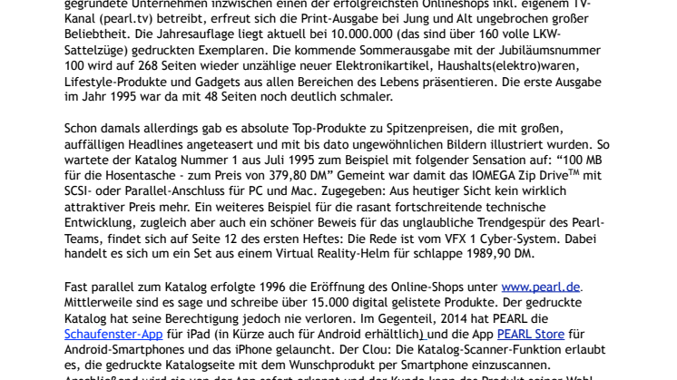 Buggingen, 02.07.2014 - 2014 feiert der Versender Pearl neben seinem 25-jährigen Jubiläum noch einen weiteren Meilenstein: Im Juli dieses Jahres erscheint der 100. Katalog aus Buggingen, der seit fast 20 Jahren in Eigenregie produziert und kostenlos an Kunden verteilt wird. Obwohl das 1989 gegründete Unternehmen inzwischen einen der erfolgreichsten Onlineshops inkl. eigenem TV-Kanal (pearl.tv) betreibt, erfreut sich die Print-Ausgabe bei Jung und Alt ungebrochen großer Beliebtheit. Die Jahresauflage liegt aktuell bei 10.000.000 (das sind über 160 volle LKW-Sattelzüge) gedruckten Exemplaren. Die kommende Sommerausgabe mit der Jubiläumsnummer 100 wird auf 268 Seiten wieder unzählige neuer Elektronikartikel, Haushalts(elektro)waren, Lifestyle-Produkte und Gadgets aus allen Bereichen des Lebens präsentieren. Die erste Ausgabe im Jahr 1995 war da mit 48 Seiten noch deutlich schmaler.