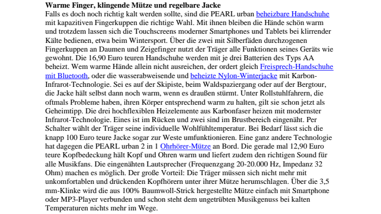 umfunktionieren. Eine ganz andere Technologie hat dagegen die PEARL urban 2 in 1 Ohrhörer-Mütze an Bord. Die gerade mal 12,90 Euro teure Kopfbedeckung hält Kopf und Ohren warm und liefert zudem den richtigen Sound für alle Musikfans. Die eingenähten Lautsprecher (Frequenzgang 20-20.000 Hz, Impedanz 32 Ohm) machen es möglich. Der große Vorteil: Die Träger müssen sich nicht mehr mit unkomfortablen und drückenden Kopfhörern unter ihrer Mütze herumschlagen. Über die 3,5 mm-Klinke wird die aus 100% Baumwoll-Strick hergestellte Mütze einfach mit Smartphone oder MP3-Player verbunden und schon steht dem ungetrübten Musikgenuss bei kalten Temperaturen nichts mehr im Wege.