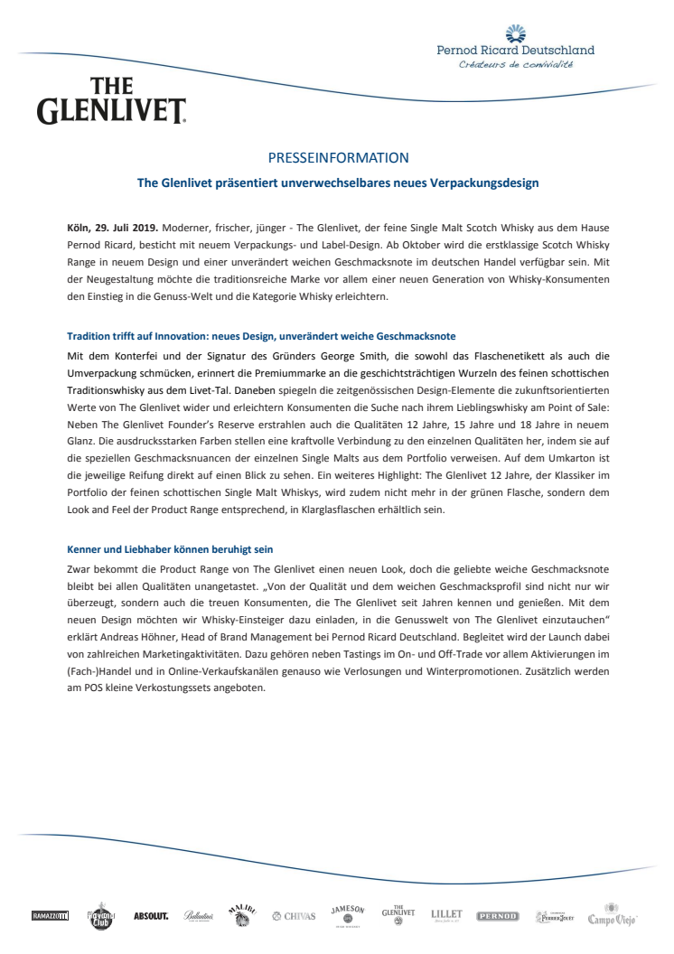 Moderner, frischer, jünger - The Glenlivet, der feine Single Malt Scotch Whisky aus dem Hause Pernod Ricard, besticht mit neuem Verpackungs- und Label-Design. Ab Oktober wird die erstklassige Scotch Whisky Range in neuem Design und einer unverändert weichen Geschmacksnote im deutschen Handel verfügbar sein.