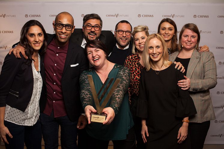 • Die Chivas Venture Gewinner feiern ihren Sieg mit Jury, Moderator und Team Chivas Regal
