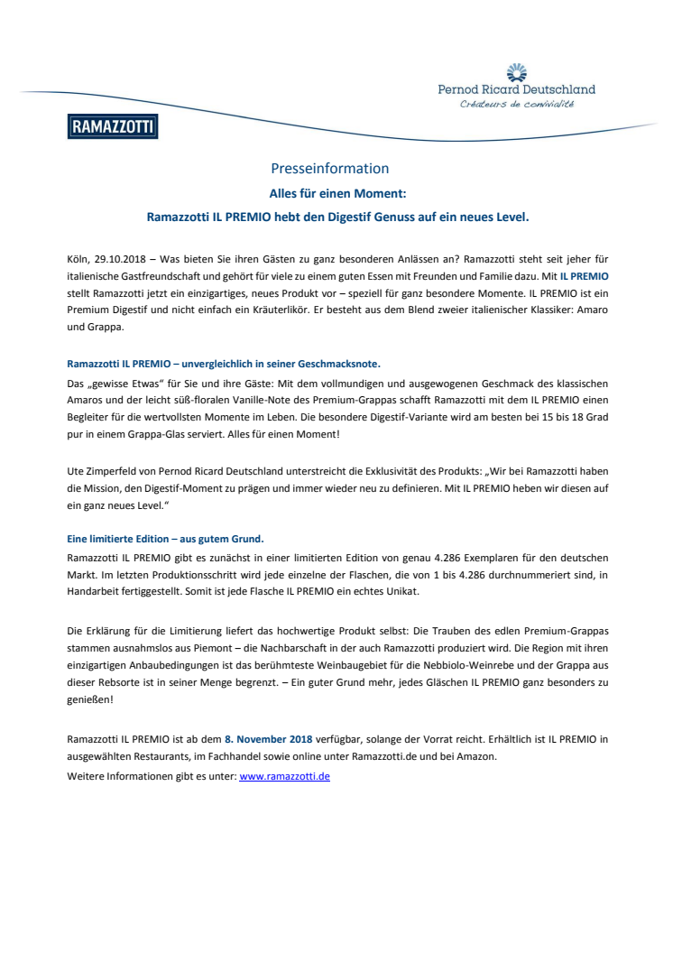 Ramazzotti IL PREMIO ist ab dem 8. November 2018 verfügbar, solange der Vorrat reicht. Erhältlich ist IL PREMIO in ausgewählten Restaurants, im Fachhandel sowie online unter Ramazzotti.de und bei Amazon.