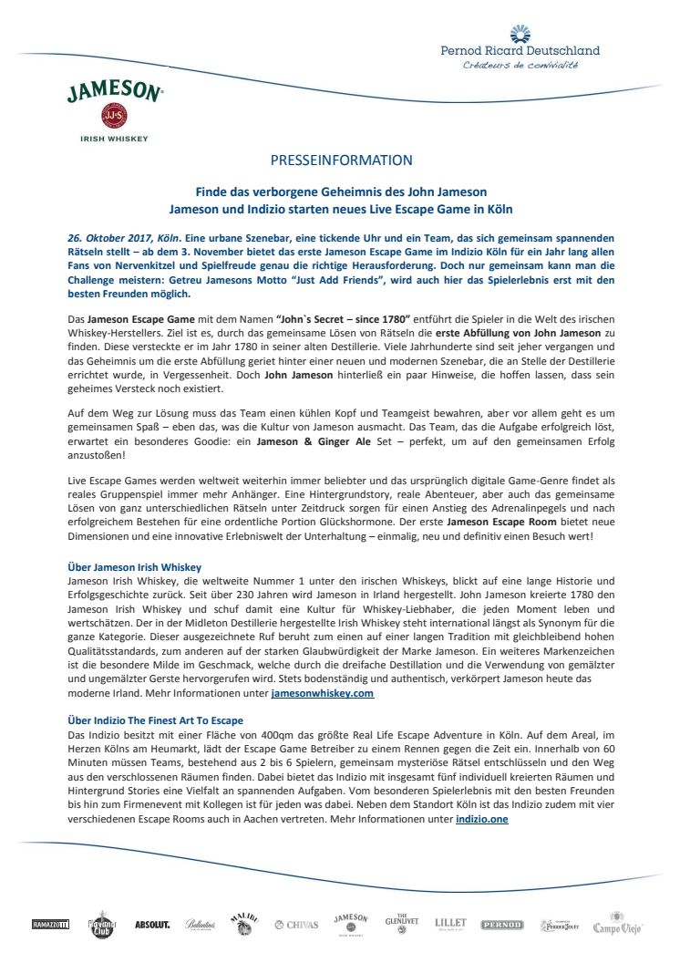 26. Oktober 2017, Köln. Eine urbane Szenebar, eine tickende Uhr und ein Team, das sich gemeinsam spannenden Rätseln stellt – ab dem 3. November bietet das erste Jameson Escape Game im Indizio Köln für ein Jahr lang allen Fans von Nervenkitzel und Spielfreude genau die richtige Herausforderung. Doch nur gemeinsam kann man die Challenge meistern: Getreu Jamesons Motto “Just Add Friends”, wird auch hier das Spielerlebnis erst mit den besten Freunden möglich.