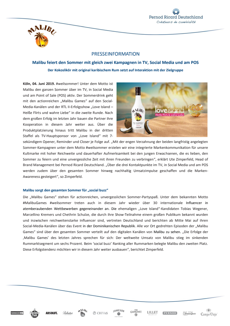 Köln, 04. Juni 2019. #weilsommer! Unter dem Motto ist Malibu den ganzen Sommer über im TV, in Social Media und am Point of Sale (POS) aktiv. Der Sommerdrink geht mit den actionreichen „Malibu Games“ auf den Social-Media-Kanälen und der RTL II-Erfolgsshow „Love Island – Heiße Flirts und wahre Liebe“ in die zweite Runde. Nach dem großen Erfolg im letzten Jahr bauen die Partner ihre Kooperation in diesem Jahr weiter aus. Über die Produktplatzierung hinaus tritt Malibu in der dritten Staffel als TV-Hauptsponsor von „Love Island“ mit 7-sekündigem Opener, Reminder und Closer je Folge auf. „Mit der engen Verzahnung der beiden langfristig angelegten Sommer-Kampagnen unter dem Motto #weilsommer erzielen wir eine integrierte Markenkommunikation für unsere Kultmarke mit hoher Reichweite und dauerhafter Aufmerksamkeit bei den jungen Erwachsenen, die es lieben, den Sommer zu feiern und eine unvergessliche Zeit mit ihren Freunden zu verbringen“, erklärt Ute Zimperfeld, Head of Brand Management bei Pernod Ricard Deutschland. „Über die drei Kontaktpunkte im TV, in Social Media und am POS werden zudem über den gesamten Sommer hinweg nachhaltig Umsatzimpulse geschaffen und die Marken-Awareness gesteigert“, so Zimperfeld.