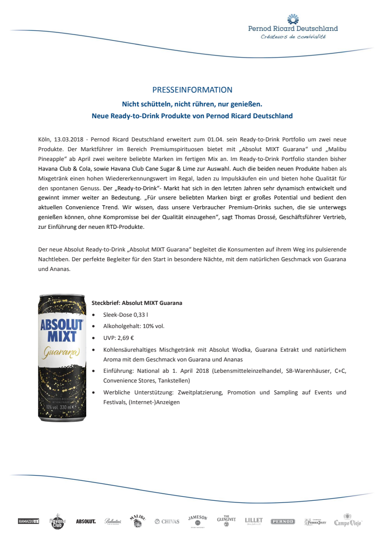 Pernod Ricard Deutschland erweitert zum 01.04. sein Ready-to-Drink Portfolio um zwei neue Produkte. Der Marktführer im Bereich Premiumspirituosen bietet mit „Absolut MIXT Guarana“ und „Malibu Pineapple“ ab April zwei weitere beliebte Marken im fertigen Mix an. Im Ready-to-Drink Portfolio standen bisher Havana Club & Cola, sowie Havana Club Cane Sugar & Lime zur Auswahl. Auch die beiden neuen Produkte haben als Mixgetränk einen hohen Wiedererkennungswert im Regal, laden zu Impulskäufen ein und bieten hohe Qualität für den spontanen Genuss. Der „Ready-to-Drink“- Markt hat sich in den letzten Jahren sehr dynamisch entwickelt und gewinnt immer weiter an Bedeutung. „Für unsere beliebten Marken birgt er großes Potential und bedient den aktuellen Convenience Trend. Wir wissen, dass unsere Verbraucher Premium-Drinks suchen, die sie unterwegs genießen können, ohne Kompromisse bei der Qualität einzugehen“, sagt Thomas Drossé, Geschäftsführer Vertrieb, zur Einführung der neuen RTD-Produkte.