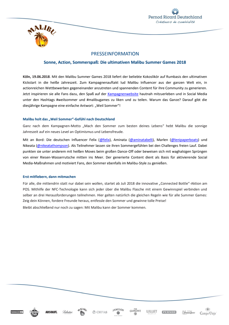 Köln, 19.06.2018. Mit den Malibu Summer Games 2018 liefert der beliebte Kokoslikör auf Rumbasis den ultimativen Kickstart in die heiße Jahreszeit. Zum Kampagnenauftakt lud Malibu Influencer aus der ganzen Welt ein, in actionreichen Wettbewerben gegeneinander anzutreten und spannenden Content für ihre Community zu generieren. Jetzt inspirieren sie alle Fans dazu, den Spaß auf der Kampagnenwebsite hautnah mitzuerleben und in Social Media unter den Hashtags #weilsommer und #malibugames zu liken und zu teilen. Warum das Ganze? Darauf gibt die diesjährige Kampagne eine einfache Antwort: „Weil Sommer“!