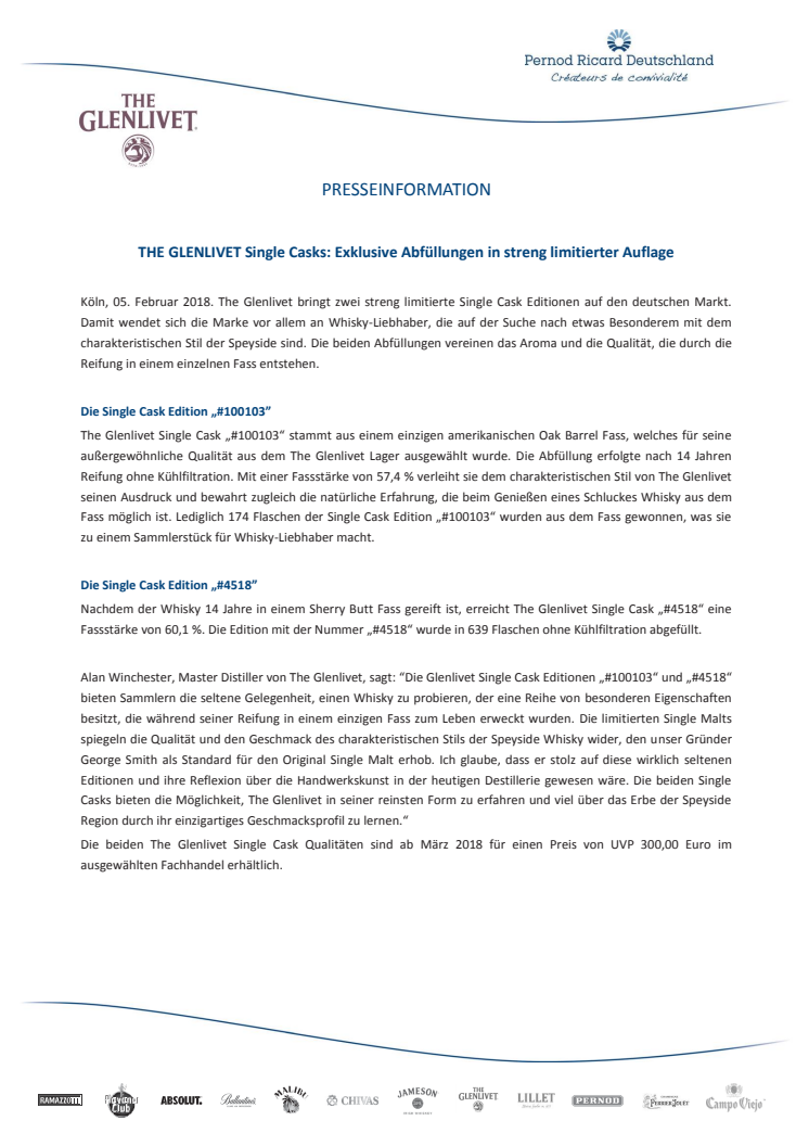 Die beiden The Glenlivet Single Cask Qualitäten sind ab März 2018 für einen Preis von UVP 300,00 Euro im ausgewählten Fachhandel erhältlich.