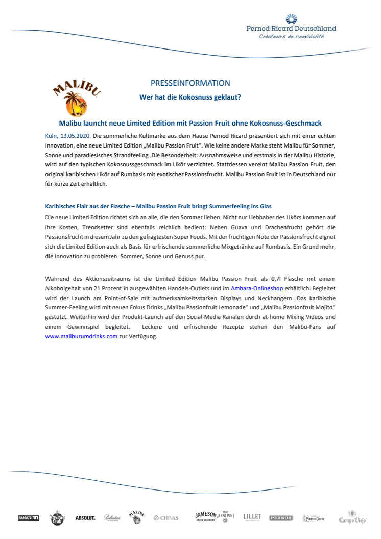 Köln, 13.05.2020. Die sommerliche Kultmarke aus dem Hause Pernod Ricard präsentiert sich mit einer echten Innovation, eine neue Limited Edition „Malibu Passion Fruit“. Wie keine andere Marke steht Malibu für Sommer, Sonne und paradiesisches Strandfeeling. Die Besonderheit: Ausnahmsweise und erstmals in der Malibu Historie, wird auf den typischen Kokosnussgeschmack im Likör verzichtet. Stattdessen vereint Malibu Passion Fruit, den original karibischen Likör auf Rumbasis mit exotischer Passionsfrucht. Malibu Passion Fruit ist in Deutschland nur für kurze Zeit erhältlich.