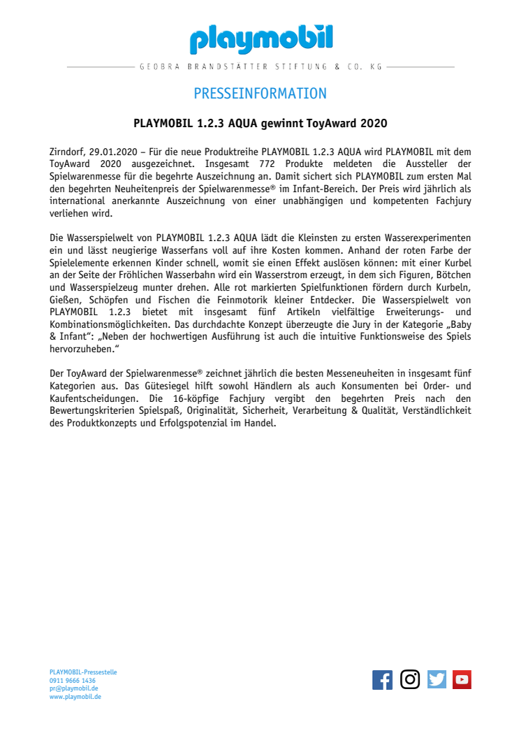 Zirndorf, 29.01.2020 – Für die neue Produktreihe PLAYMOBIL 1.2.3 AQUA wird PLAYMOBIL mit dem ToyAward 2020 ausgezeichnet. Insgesamt 772 Produkte meldeten die Aussteller der Spielwarenmesse für die begehrte Auszeichnung an. Damit sichert sich PLAYMOBIL zum ersten Mal den begehrten Neuheitenpreis der Spielwarenmesse® im Infant-Bereich.