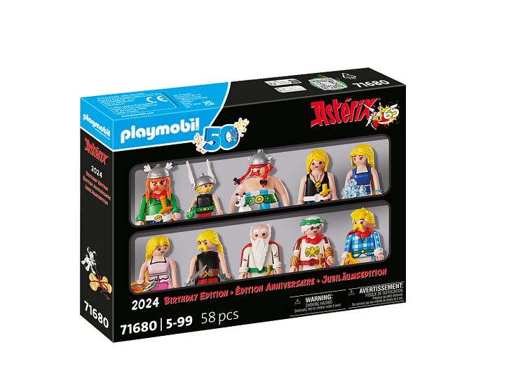 Das Asterix Figurenset erscheint anlässlich des 50-jährigen Jubiläums von PLAYMOBIL und des 65-jährigen Jubiläums von Asterix. Die limitierte Auflage beinhaltet zehn der besonders markanten Charaktere des gallischen Universums.
