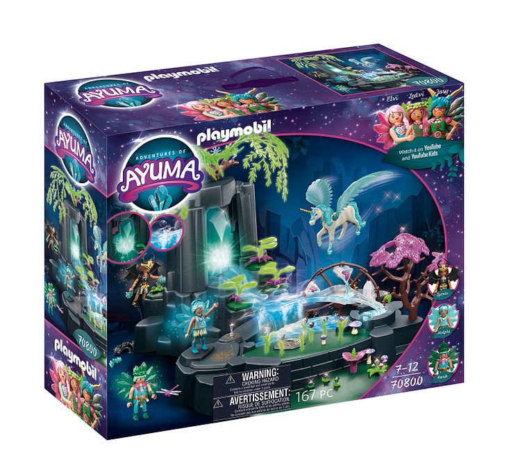 Das Herz von Ayuma, die Magische Energiequelle, begeistert mit besonderen Funktionen. Ihr Kristall leuchtet und im See erscheint ein flackerndes Licht. Durch Drehen des Wasserrads fangen die Blumen am See wie durch Zauberhand an zu wachsen und Nebelschwaden steigen auf. Das Set besitzt geheimnisvoll nachleuchtende Elemente wie die Äste der Trauerweide.
