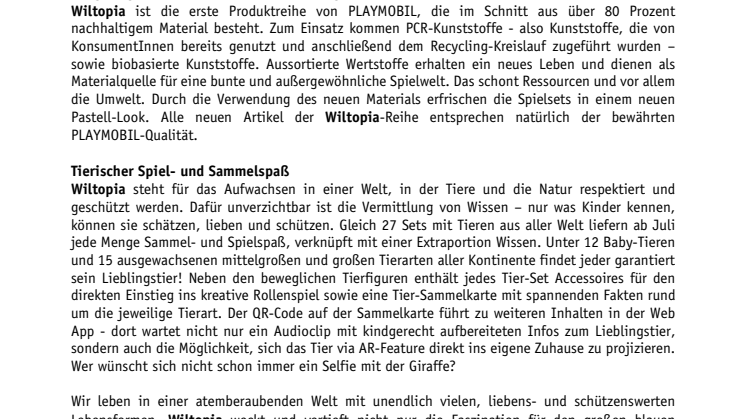 • Spannend für Kinder – Gut für die Umwelt: Erste nachhaltige PLAYMOBIL-Produktreihe WILTOPIA startet