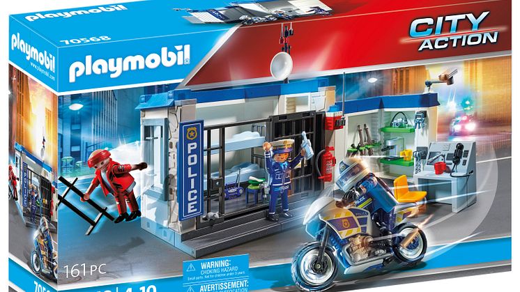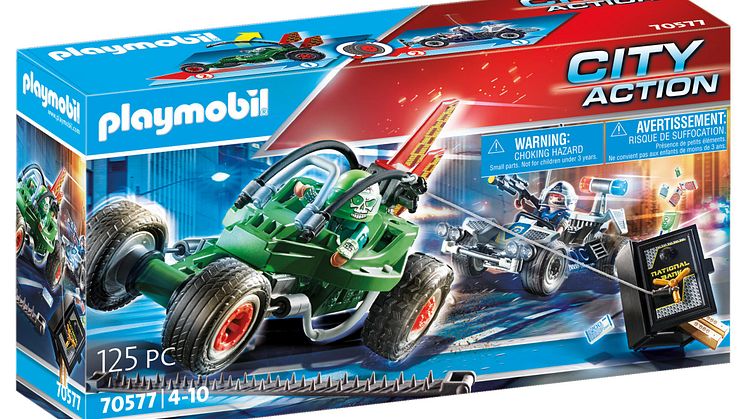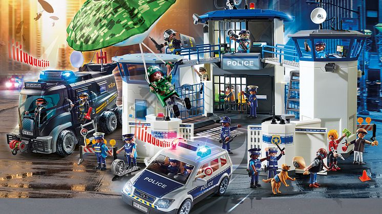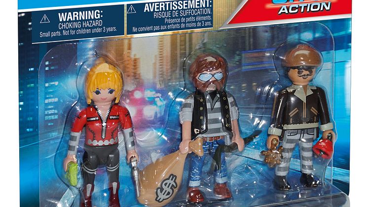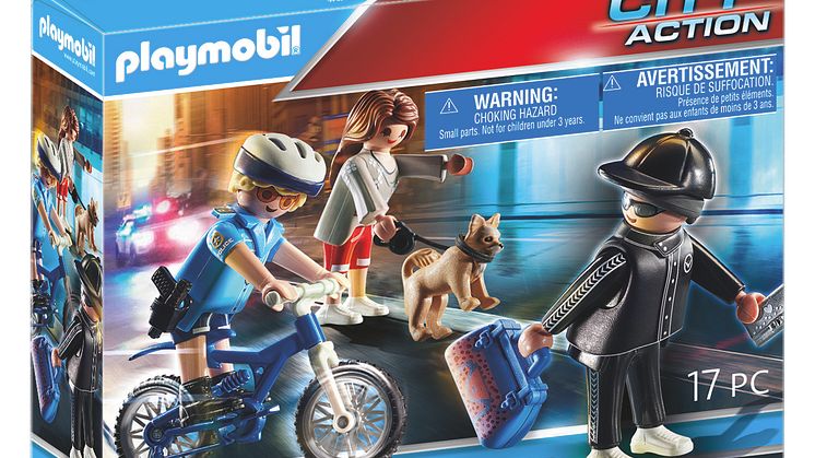 Ein Team ruchloser Ganoven heckt einen großen Coup aus: Mit vereinten Kräften planen sie nach der Befreiung ihres Kumpanen aus dem Gefängnis einen spektakulären Überfall. Während einer der Verbrecher für Ablenkung sorgt, wollen seine Komplizen alles abräumen, was sie nur finden können – egal ob Tresor, Handtasche oder Geldautomat. Doch die PLAYMOBIL-Polizei ist den Schurken wie gewohnt einen großen Schritt voraus! Mit ihrer cleveren Taktik, den vielseitigen Einsatzfahrzeugen und technischen Gadgets ist die Verbrecherjagd ein Kinderspiel. Nach der Flucht aus dem Gefängnis wird der Schurke mit dem Motorrad schnell wieder eingeholt und dank des wendigen Polizei-Hubschraubers können die Einsatzkräfte auch den Ganoven-Fallschirm abfangen. Während der transformierbare Polizei-Roboter den ersten Schurken dingfest macht, nehmen auf unwegsamen Strecken Geländewagen, Motorrad, Kart oder Fahrrad die Verfolgung der Ganoven-Bande auf und selbst das Fluchtfahrzeug der Verbrecher hat keine Chance, dem Polizei-Heli zu entkommen. Voller Erfolg für die Einsatzkräfte der PLAYMOBIL-Polizei!