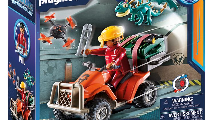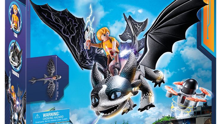 Kleine und große Fans können sich bei den neuen Sets darauf freuen, gemeinsam mit den Freunden aus DreamWorks „Dragons: The Nine Realms“ in eine mysteriöse, verborgene Welt aufzubrechen, in der es Drachen wirklich gibt. Mit dem Spielset Thunder & Tom kommt der Drachenspielspaß nach Hause: Thunder kann alle vier Beine sowie seinen Kopf und die Flügel bewegen. Der integrierte Sattel ermöglicht es Tom, auf Thunder zu reiten. Thunders Rückenkamm ist mit einem Lichtmodul ausgestattet und er kann Plasmapfeile aus seinem Maul schießen. Die PLAYMOBIL-Drachenfigur Wu & Wei ist mit beweglichen Beinen, Köpfen und Hälsen ausgestattet. Die großen Flügel sind in alle Richtungen drehbar. Dank der Sättel können Jun und Eugene auf dem Drachen reiten. Aus den beiden Drachenköpfen kann jeweils ein Feuer- bzw. Eispfeil geschossen werden. Plowhorn besitzt, neben beweglichen Beinen und Unterkiefer, auch aufklappbare Flügelschalen. Ein kleines Horn auf dem Kopf dient D'Angelo als Fußklemmung zum Reiten. Mit seinem Horn kann Plowhorn den großen Kristall sprengen. Auch mit dem Feathers & Alex Spielset können Kinder die Drachenabenteuer jetzt zu Hause nachspielen. Beine, Kopf und Flügel der Drachenfigur sind beweglich. Die Federn an Hinterkopf und Schwanz sind aus weichem Material gefertigt. Durch den montierten Sattel kann eine Figur auf dem Rücken des Drachens sitzen.