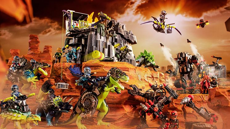 Der neue Dino Rock mit spektakulärer Ausbruchfunktion und kombinierbaren Licht-/Sound- und Vibrationsfeatures steht im Zentrum der Geschichte. Mit dem angrenzenden Lager der guten und der bösen Partei eröffnet das Set viele spannende Spielmöglichkeiten. Bereits im Handel erhältlich sind verschiedene Dinosaurier, jeweils ausgestattet mit einer funktionalen Rüstung: Ian fordert den angreifenden Kampfläufer auf dem Rücken seines T-Rex mit titanharter Schutzpanzerung heraus. Seine stärkste Waffe ist das gefährliche Fass-Katapult. Gleich doppelte Verteidigungs-Power bringt der Spinosaurus mit Schutzpanzer und Kanonen mit, denn auf seinem Rücken haben gleich zwei treue Freunde von Ian Platz – Ayla und Samu. Uncle Robs Neffe Milow versucht, die Pläne eines fiesen Kampfläufers auf dem Rücken seines Saichania zu vereiteln, während das Superbrain Jaden mit seinem gepanzerten Triceratops eine besondere Fangnetzkanone gegen die tückischen Miniroboter ins Spiel bringt. Am Himmel setzt der geheimnisvolle Kaidan auf seinem Flugsaurier die gegnerische Flugdrohne mit Schrottteilgeschossen außer Gefecht. Und natürlich hat auch der Mentor der Crew, Uncle Rob, einen Dino an seiner Seite – den Deinonychus mit extrastarker Panzerung und Kanonen.