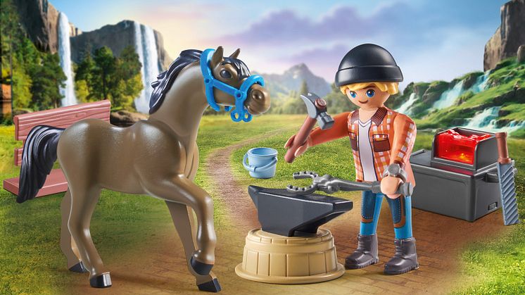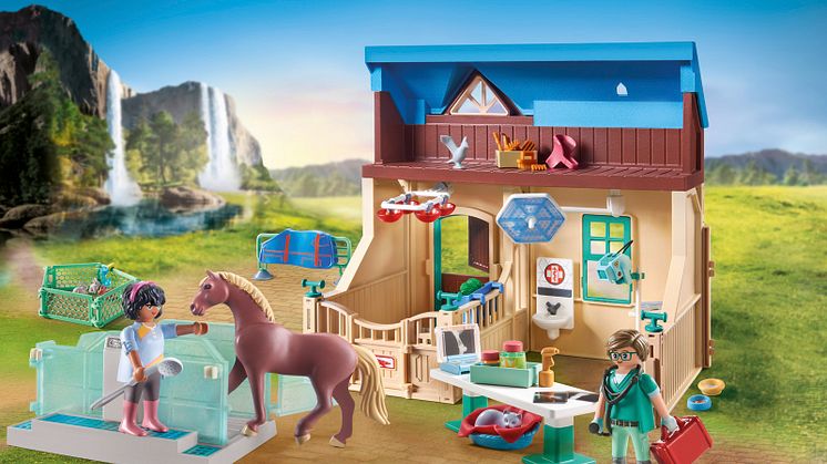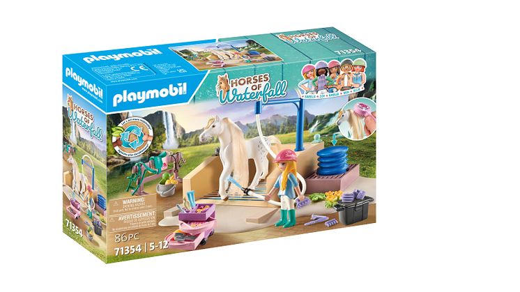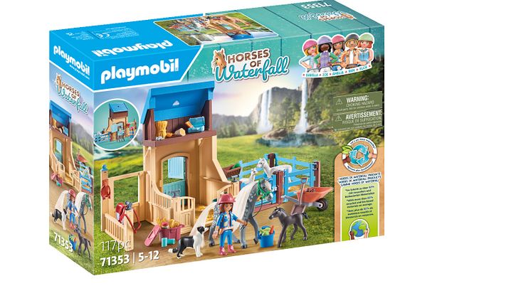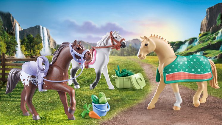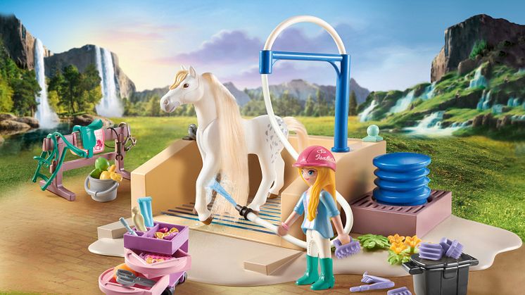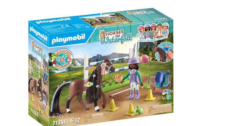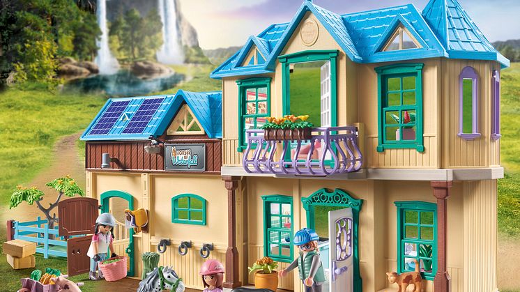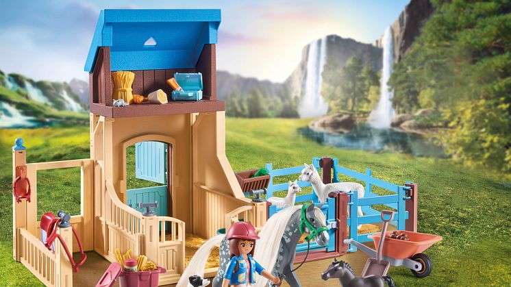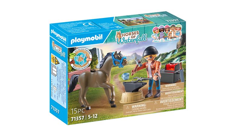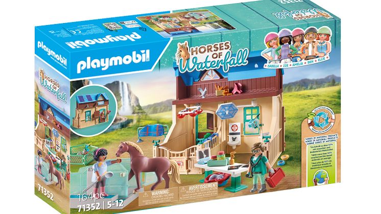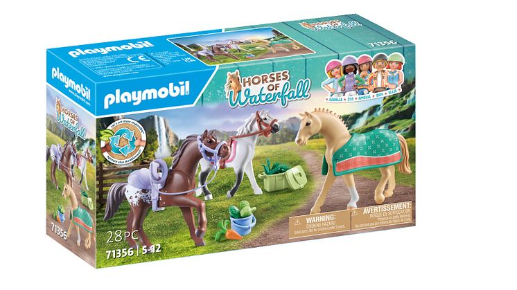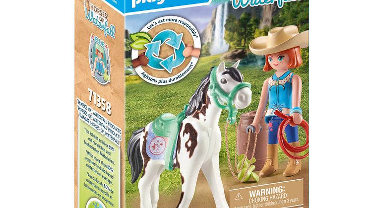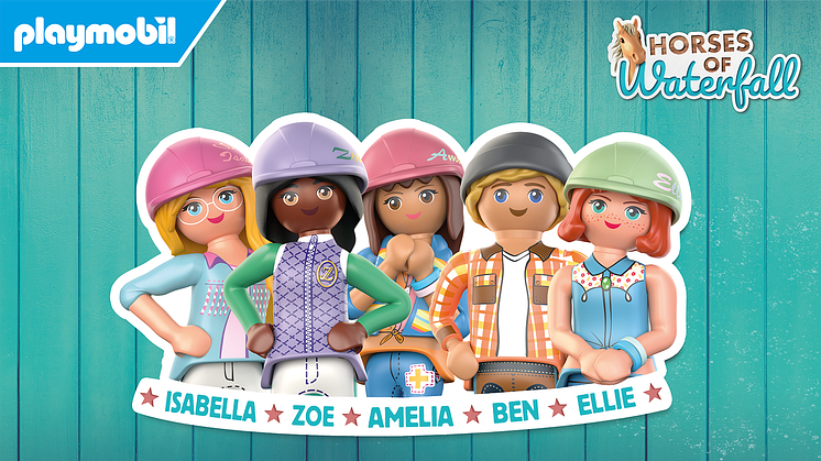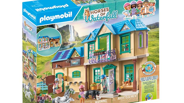 Für die fünf besten Pferde-Freund:innen Amelia, Isabella, Zoe, Ellie und Ben ist die Waterfall Ranch ein wunderbarer Ort. Gemeinsam mit ihren Pferden verbringen sie dort jede freie Minute. Zwischen Reittraining und Pferdepflege erwartet sie immer auch ein spannendes Abenteuer. Die Spielsets der neuen Pferdewelt „Horses of Waterfall“ von PLAYMOBIL bestehen im Schnitt zu über 80% aus recycelten und biobasierten Materialien.