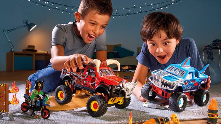 Die waghalsigen PLAYMOBIL-Stuntleute scheuen kein Risiko, um heute eine Show der Superlative zu zeigen: Ihre coolen Monster Trucks Horned und Shark machen vor keinem H
